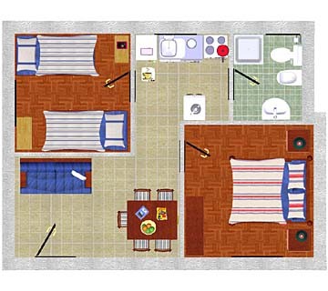 The apartment comprises a double bedroom, a bedroom with two single beds, a living room with a single bed, two bathrooms with showers, a kitchenette, and a refrigerator.