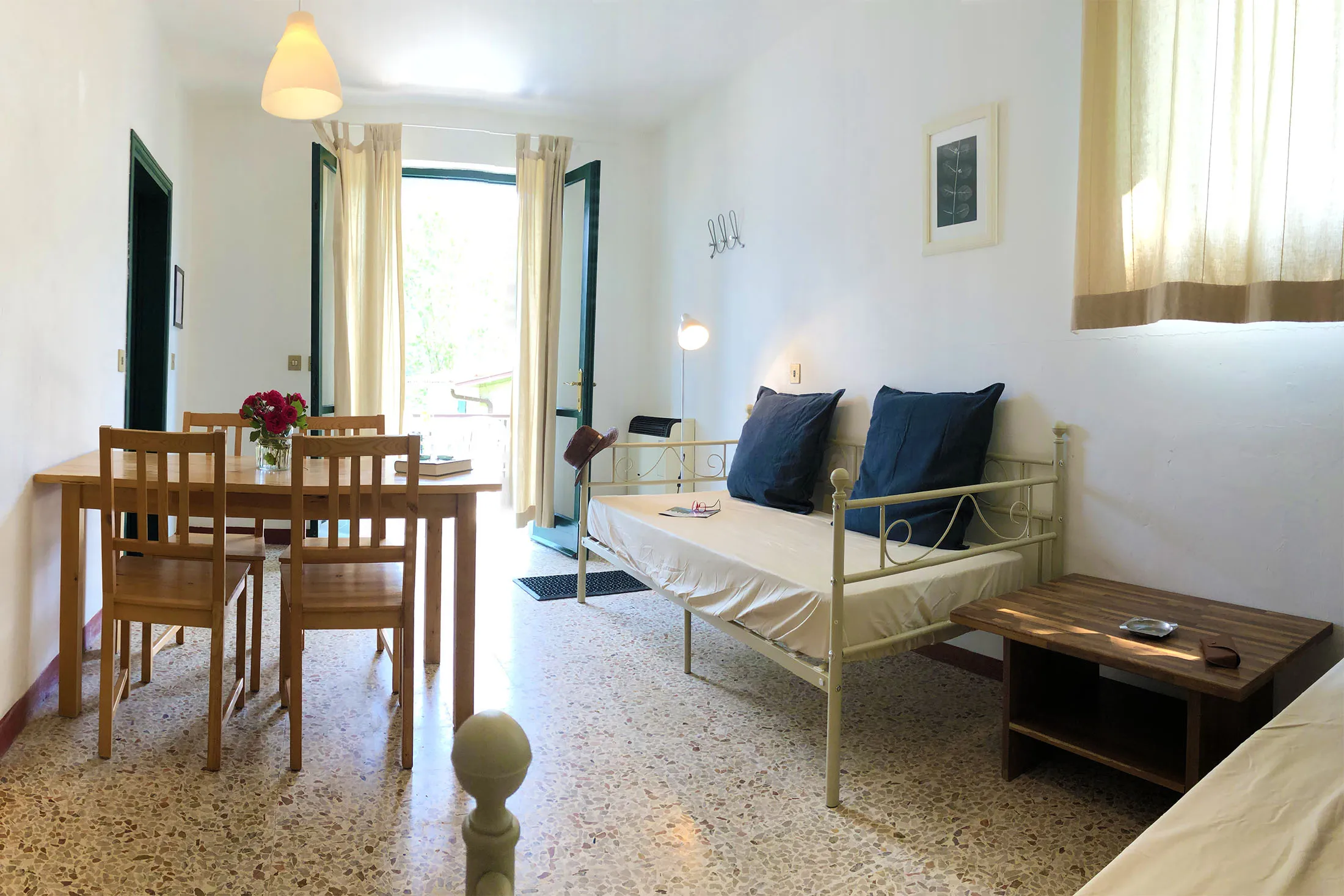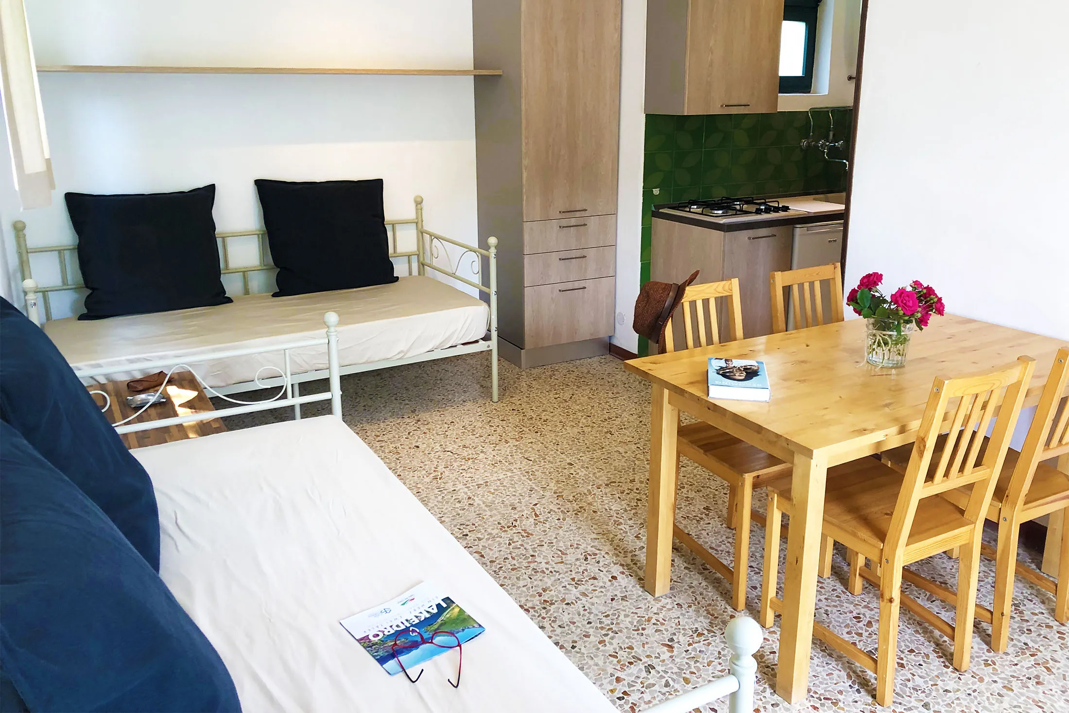 The apartment comprises a double bedroom, a living room with two single beds and kitchenette, a bathroom with shower.