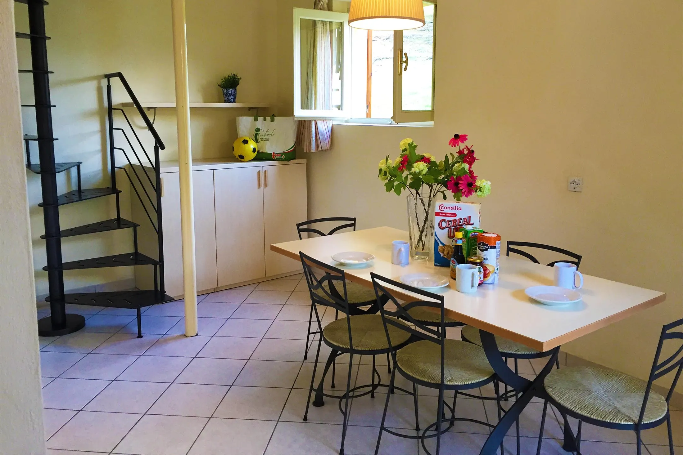 This spacious accommodation is located in a semi-detached house. The 70 m² lake-view apartment can accommodate up to 7 people and is spread over two floors, with the living area on the ground floor and the sleeping area on the first floor, accessible by a spiral staircase.