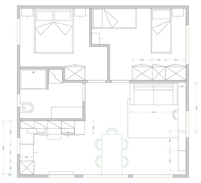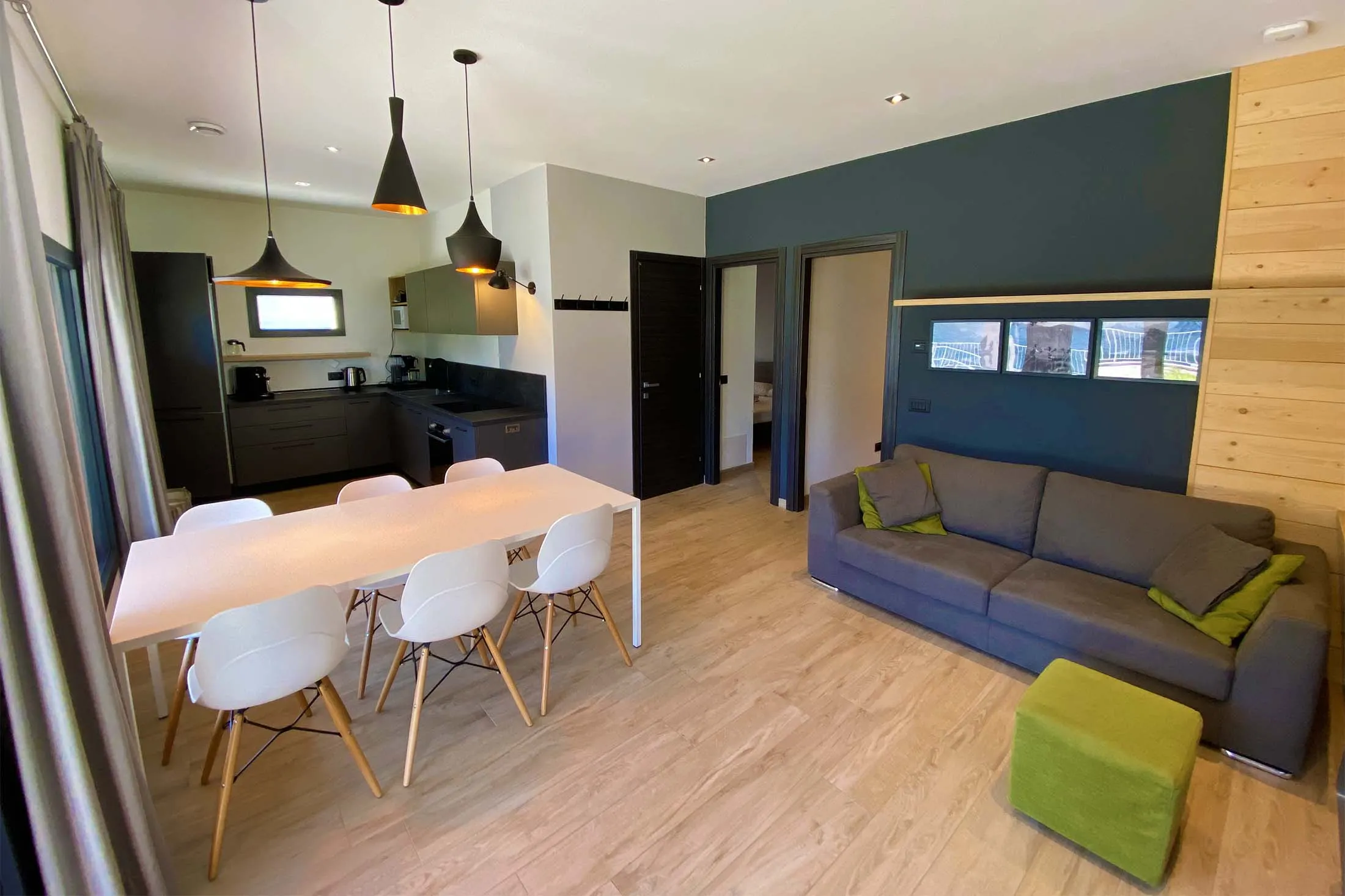 The accommodation bedroom with a double bed and a children's room with a bunk bed and a single bed with a pull-out bed, a living room with kitchen, a bathroom with shower.