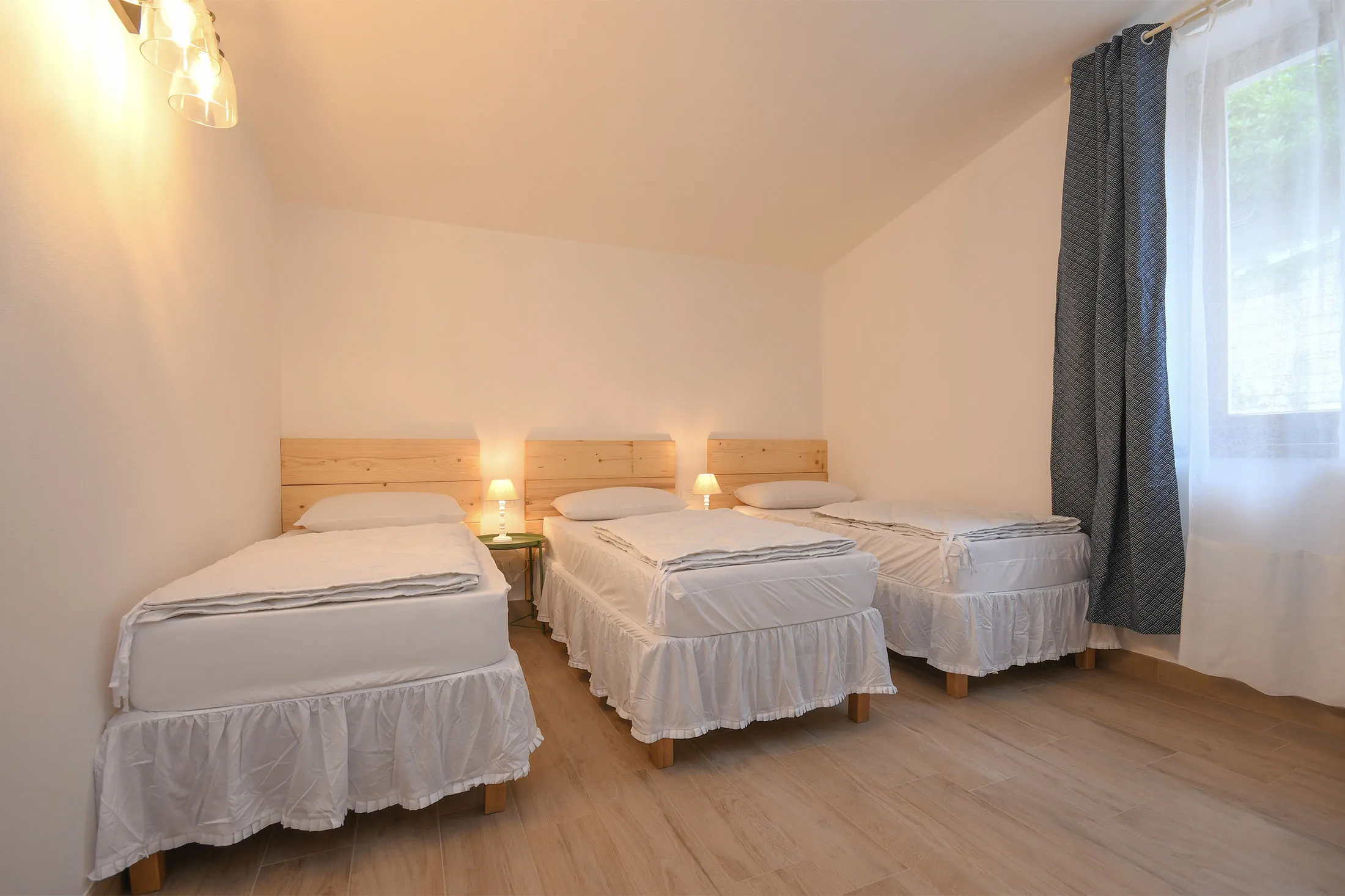 The accommodation comprises a double bedroom, a bedroom with three single beds, a living room with kitchen, and a bathroom with shower.