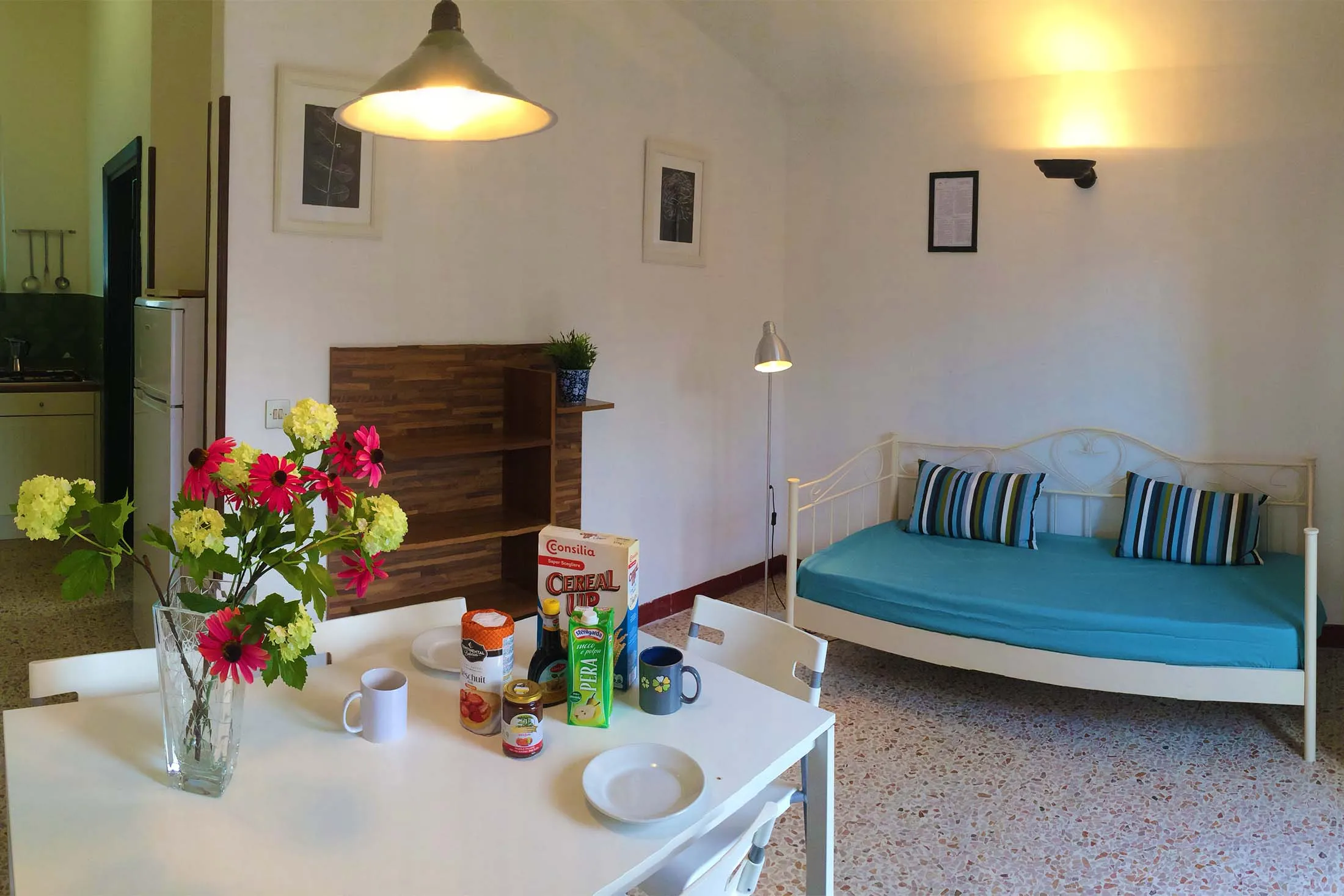 De accommodatie bestaat uit een slaapkamer met een tweepersoonsbed, een slaapkamer met twee eenpersoonsbedden, een woonkamer met een eenpersoonsbed, een badkamer met douche, een kitchenette en een koelkast.