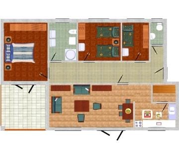 De accommodatie bestaat uit een tweepersoonsslaapkamer, twee slaapkamers met elk twee eenpersoonsbedden, een grote woonkamer, een keuken, een badkamer met douche en een gastentoilet.