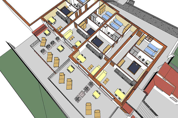 De accommodatie bestaat uit een tweepersoonsslaapkamer, een slaapkamer met drie eenpersoonsbedden, een woonkamer met keuken en een badkamer met douche.